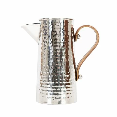 The Stainless Steel Bolt Hammered Jug with Leather Handle by Flair Decor will take the act of pouring water, and transform into an art form. Made from stainless steel, this jug has a leather finish handle and features an antique large bolt hammered design.